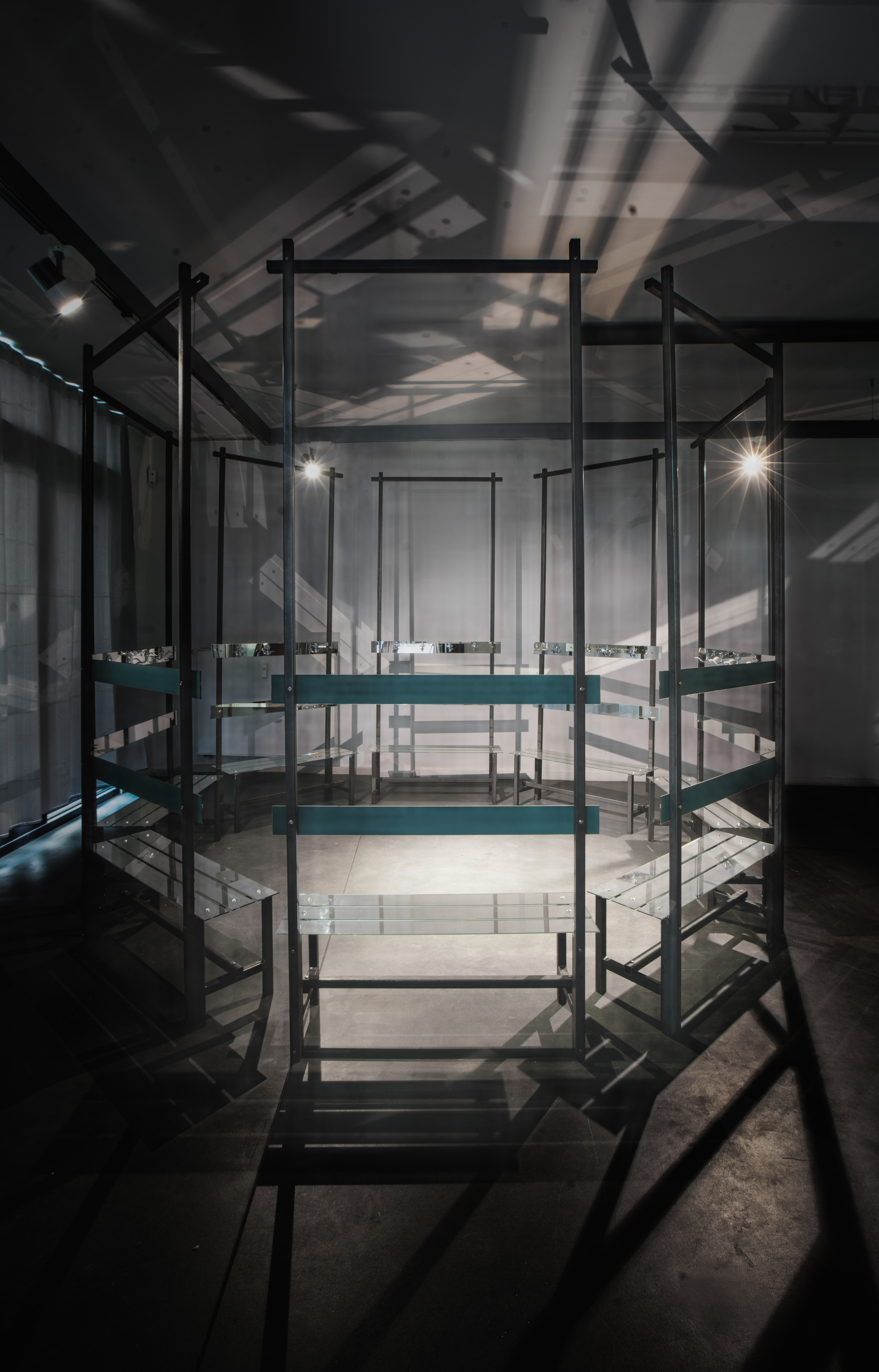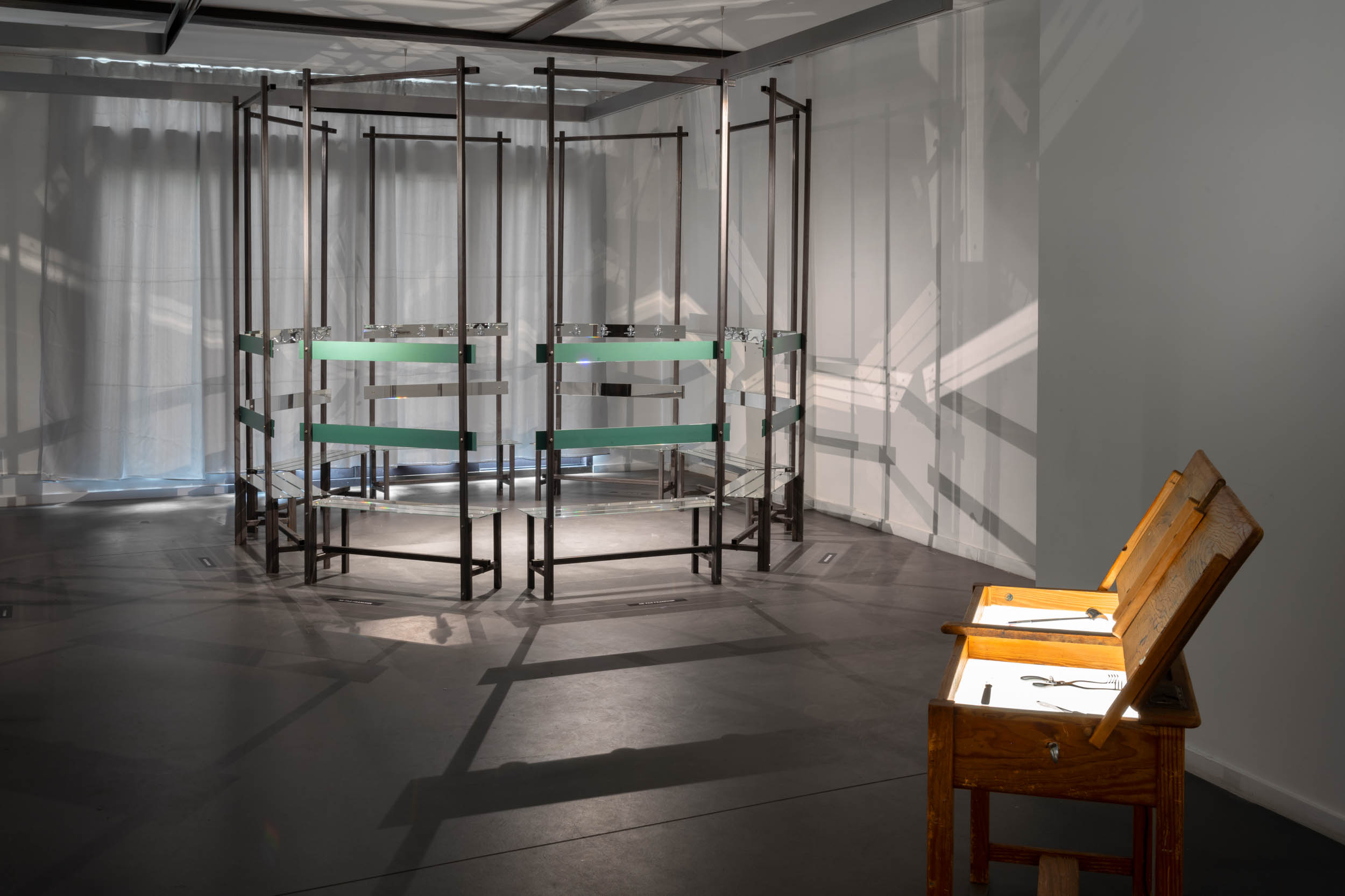 Des bancs de vestiaire d’école, inhospitaliers, forment un cercle fermé. À hauteur d’enfant, des miroirs renvoient les regards, en écho à une identité en construction, façonnée par le regard des autres. Dans l’entre-soi des vestiaires naissent les premiers jeux de pouvoir, les premières violences, les premiers harcèlements. Les spots éclairent un espace vide, en attente d’un événement. La lumière diffractée crée des ombres instables, cauchemardesques. Entre l’arène sportive et le théâtre social, l’œuvre interroge le moment charnière où chacun·e choisit son armure et son rôle dans le jeu des autres.