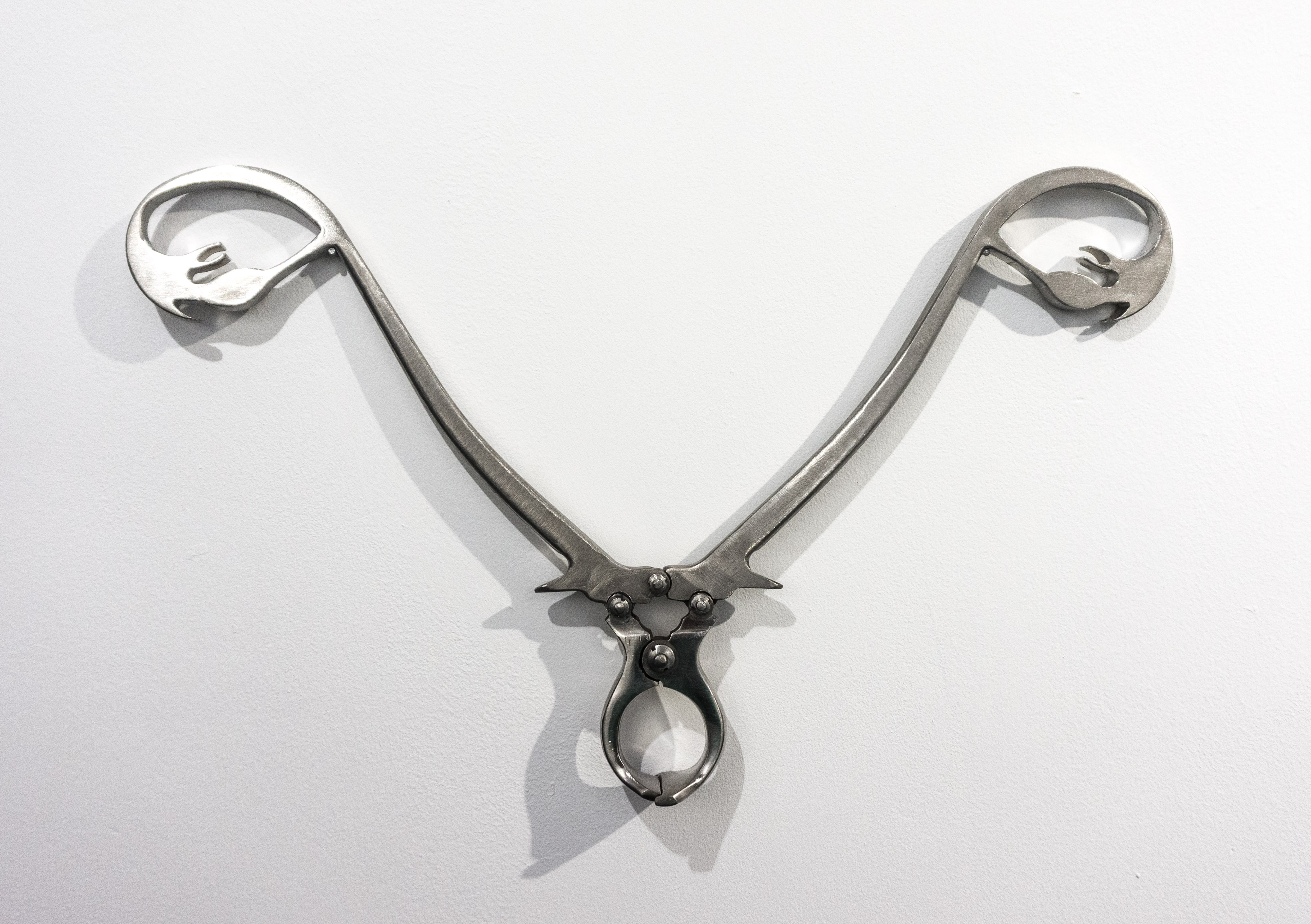 « Pince à castrer les agneaux #2 » détourne un outil agricole en y greffant des trompes de Fallope à la place des poignées métalliques d’origine. En croisant l’univers de la reproduction animale et celui du corps féminin, l’œuvre met en tension les rapports de domination, de contrôle et de violence systémiques exercés sur les corps – qu’ils soient humains ou non. Ce geste de transformation rend visible l’articulation entre pouvoir, genre et biologie, et interroge la manière dont certaines violences sont institutionnalisées et banalisées.